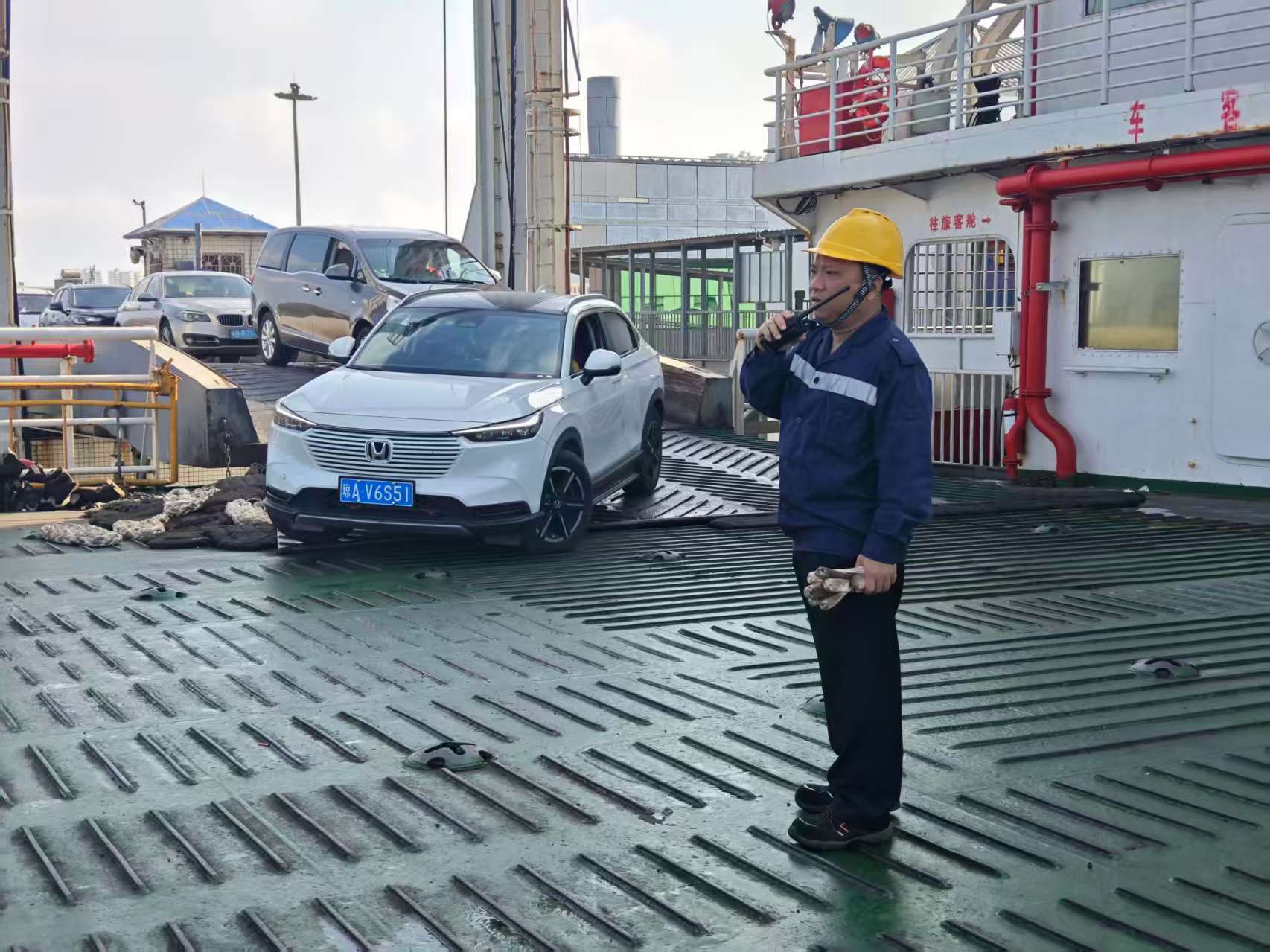 “往左打满”“回正”“倒车”“停”……刘昱声息洪亮,手势标准。在他的带领下,一辆辆汽车有序驶上船面。车辆停稳后,他又赶紧搬起三角木垫在车轮前后,并布置司机熄火下车,作为干脆利落。